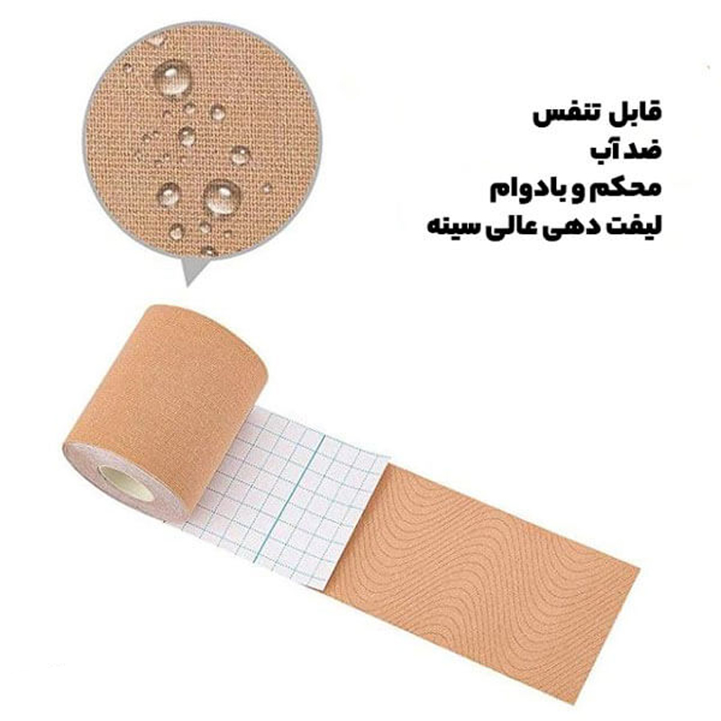این چسب لیفت سینه دارای پهنای 5 سانتی متر می باشد و ماده ی تشکیل دهنده ی آن از 95 درصد پنبه و 5 درصد فیبر کشسان مصنوعی تهیه شده است. این ترکیب دارای منافذی است که هوا را به منافذ پوست که در زیر چسب قرار می گیرد می رساند و از تعرق پوست جلوگیری می کند. استحکام این نوار چسب بالاست و عرق کردن، شنا کردن و یا تکان خوردن های شدید منجر به جدا شدن چسب از بدن نمی شود. چسب لیفت بسیار کشسان است و تقریبا تا 2 برابر طول اولیه ی خود قابلیت کشیده شدن دارد و به هنگام استفاده از آن احساس نمی کنید که چیزی به بدن چسبیده است. جهت استفاده از چسب باید به اندازه ی مورد نیاز و متناسب با سایز سینه ی خود از آن برش بزنید و پس از هر بار استفاده آن را دور بیاندازید . نوار چسب به رنگ پوست می باشد و به راحتی نمی توان تفاوت آن با رنگ پوست را تشخیص داد. این ویژگی باعث می شود که بتوان از آن در زیر لباس های نازک، تاپ ها، لباس عروس ، لباس شنا و … استفاده کرد. این مدل چسب لیفت سینه می تواند حتی سنگین ترین سینه ها را به سمت بالا هل دهد و به آن ها فرم می دهد تا به فرم دلخواه خود برسید. از این چسب می توانید برای پوشاندن عضلات پا یا دیگر نقاط بدن هنگام تمرین نیز استفاده کنید.