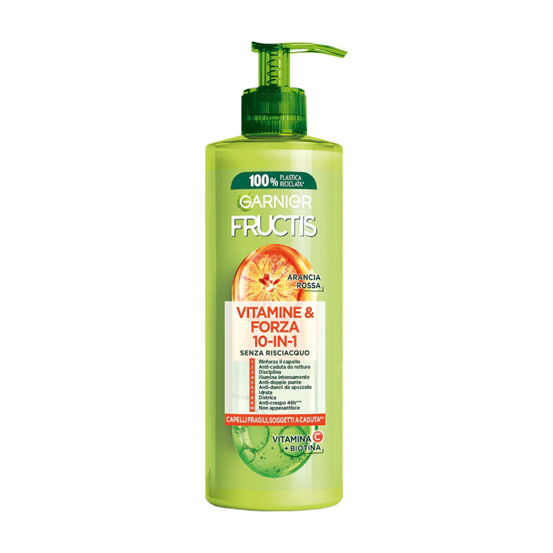 کرم موی 10 کاره گارنیر فروکتیس مدل VITAMINE & FORZA محصول مراقبتی بعد از حمام، بدون نیاز به آبکشی و مناسب موهای ضعیف و مستعد به ریزش می باشد. این کرم مو حاوی بیوتین و ویتامین های C و E با خواص 10 گانه برای موها می باشد. کرم موی ویتامنیه گارنیر تقویت کننده، براق کننده عالی، صاف کننده، آبرسان، ضد وز تا 48 ساعت، ضد گره، ضد ریزش، ضد موخوره و محافظ مو در برابر براشینگ می باشد. این کرم دارای بافت سبک جهت جلوگیری از ایجاد سنگینی بر روی موها می باشد.