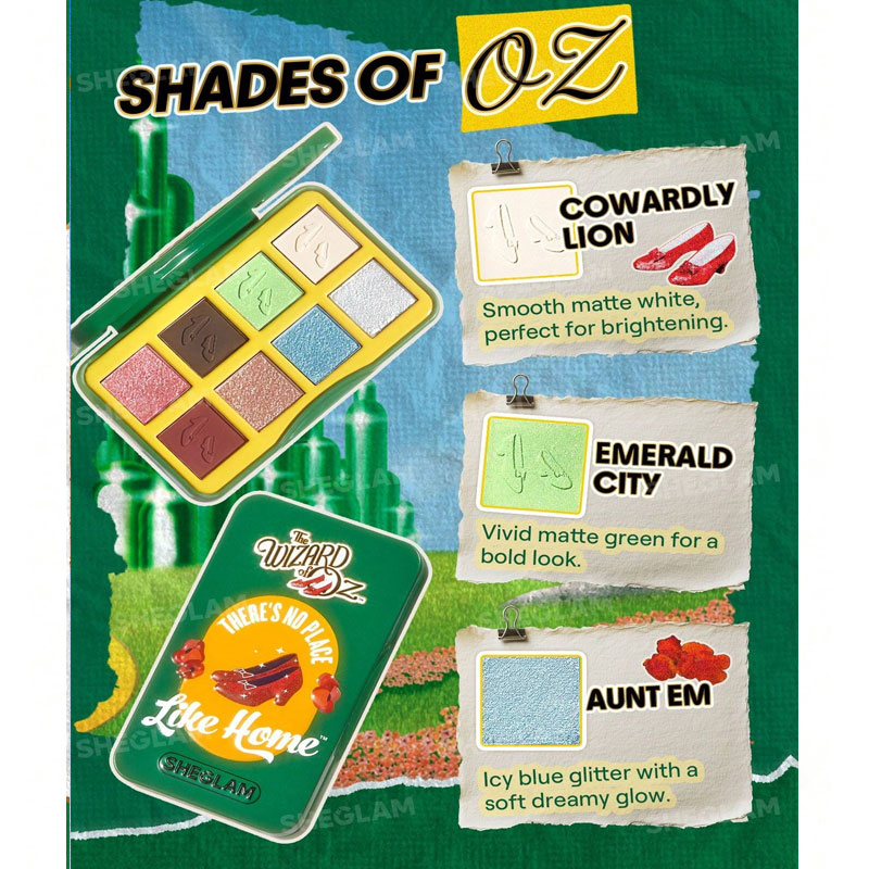 پالت سایه چشم No Place Like Home: شامل 8 رنگ با نامهای Aunt Em (کرم مات)، Kansas (قهوهای مات)، Scarecrow (طلایی شیمری)، Glinda (صورتی شیمری)، Emerald City (سبز درخشان)، و غیره، مناسب برای آرایشهای روزمره و فانتزی