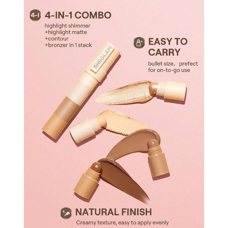 قلم چندکاره آرایشی SHEGLAM Multi-Glam یک ابزار زیبایی کامل ۴ در ۱ است که شامل هایلایتر براق، هایلایتر مات، کانتور و برنزر است؛ همه در یک طراحی باریک و شبیه به قلم. بافت نرم آن بهآسانی روی پوست میلغزد و ترکیب آن برای ایجاد ظاهری طبیعی و خوشفرم ساده است.