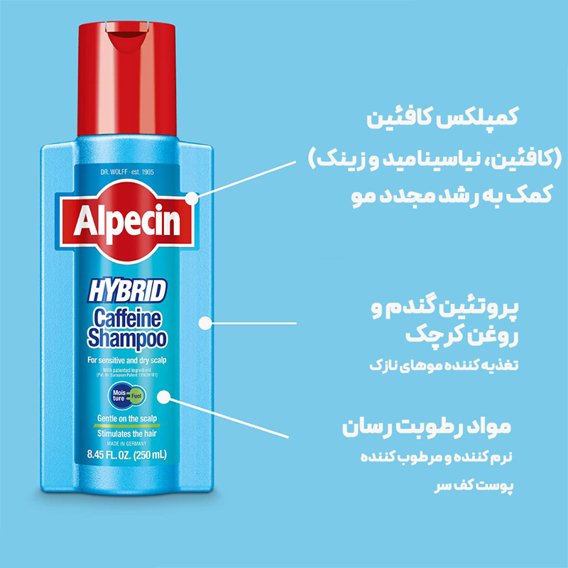 شامپو موهای حساس کافئین آلپسین مدل HYBRID حجم 250ml